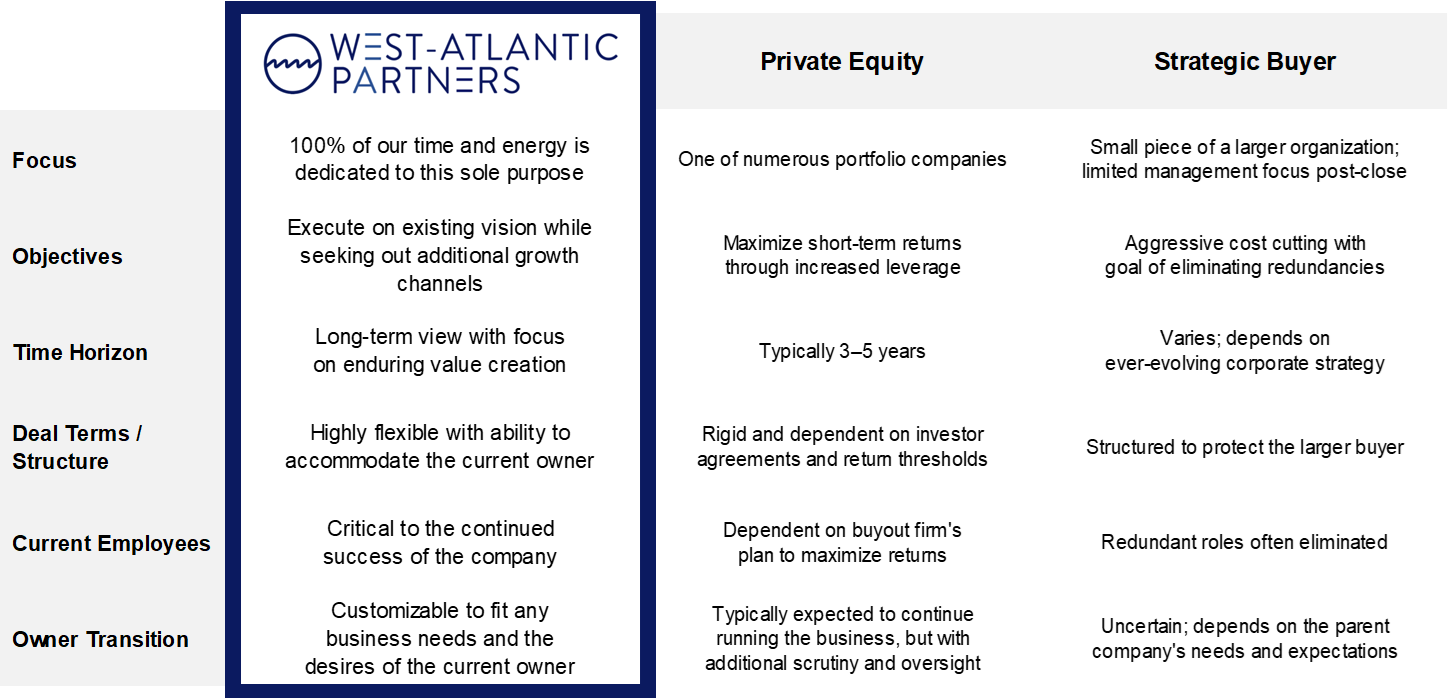 Unlike private equity, you’re not just another portfolio company. Yours is the company. We hope to partner with you and your employees at a time when you and your business are at a natural point of transition or merely looking for an external perspective.